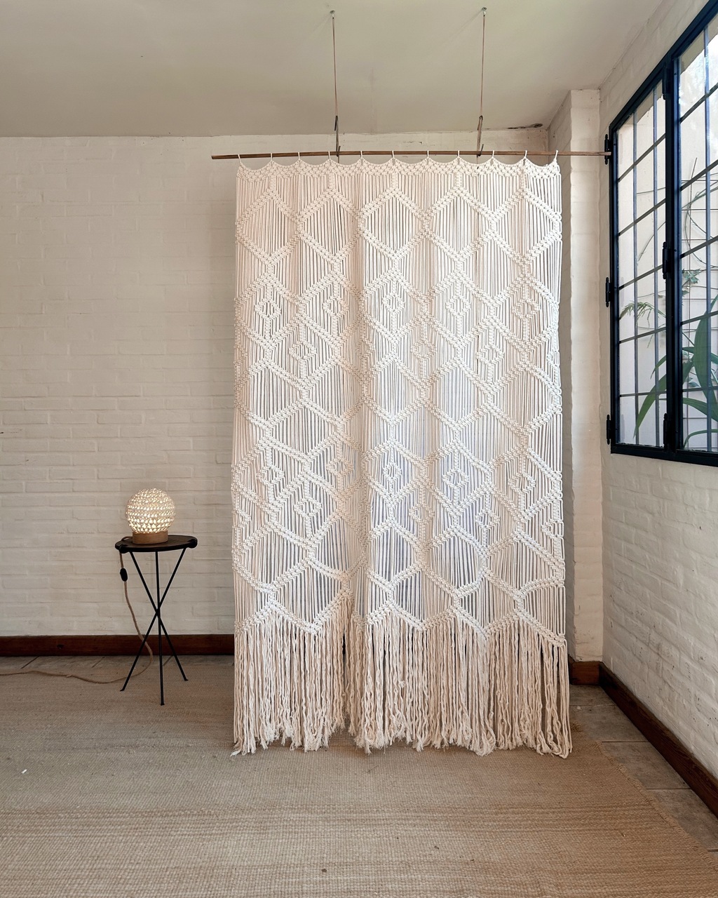 Tejida íntegramente a mano en macramé con cordón de algodón de 3 mm, la Cortina Fausta es una pieza artesanal que aporta textura, movimiento y calidez a cualquier espacio. Sus flecos de hilo multihebras prolongan el tejido con un efecto suave y fluido, creando un detalle decorativo que transforma el ambiente sin imponerse.