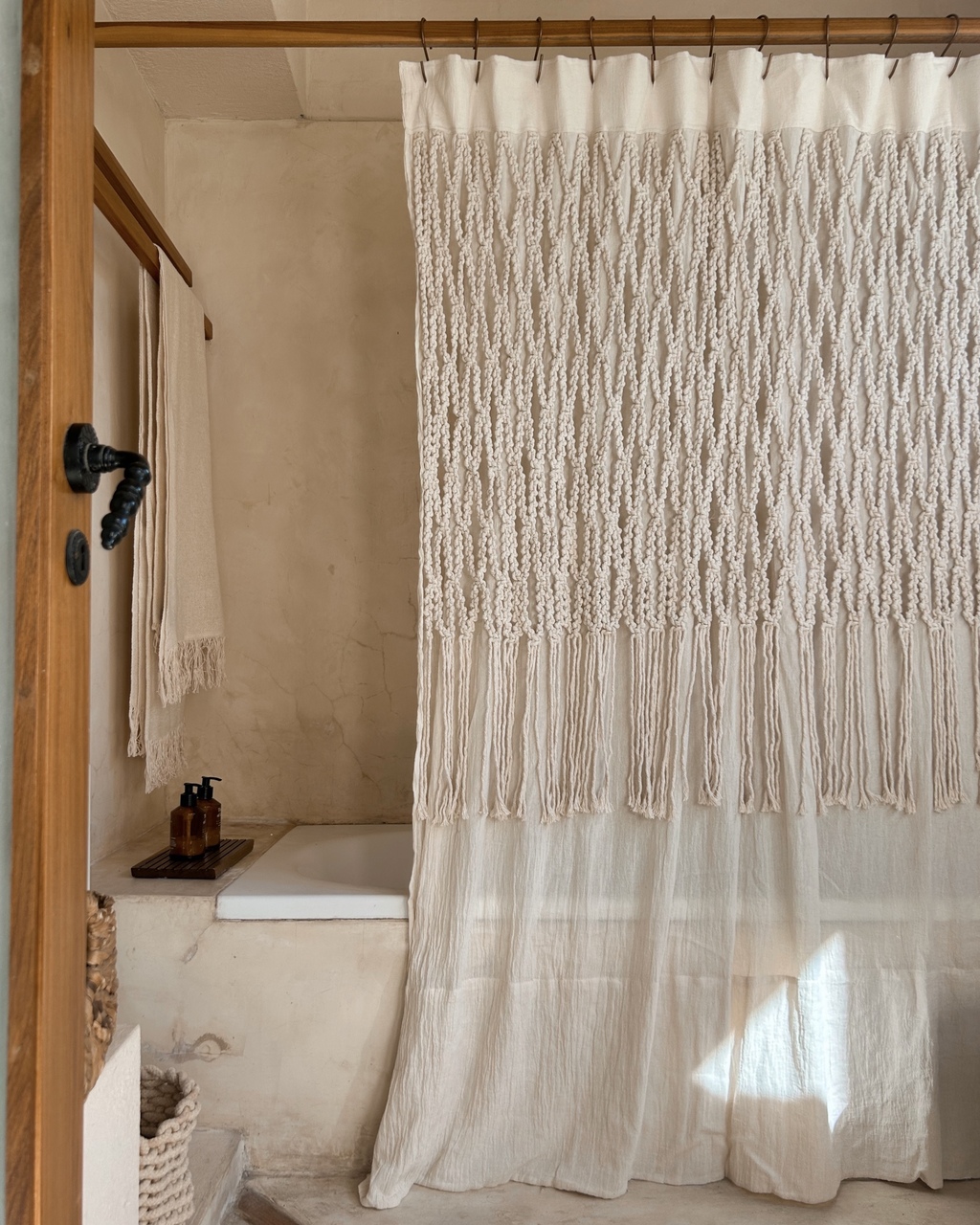 Una pieza artesanal diseñada para sumar textura, elegancia y calidez natural a tu baño. La Cortina Aurora está confeccionada a mano con una delicada guarda de macramé que cae desde la parte superior, unida hilo a hilo al género con dedicación y detalle, logrando un acabado único y orgánico.