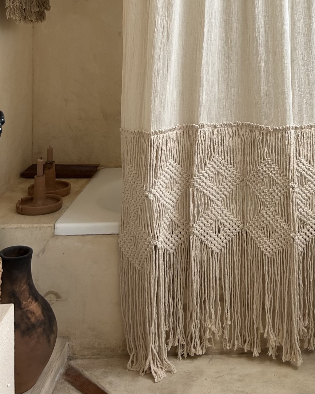 Una pieza artesanal que combina funcionalidad y diseño natural. La Cortina Luisa lleva una delicada guarda de macramé tejida a mano en la parte inferior, unida hilo a hilo al género con cuidado y precisión, creando un acabado único y lleno de textura.